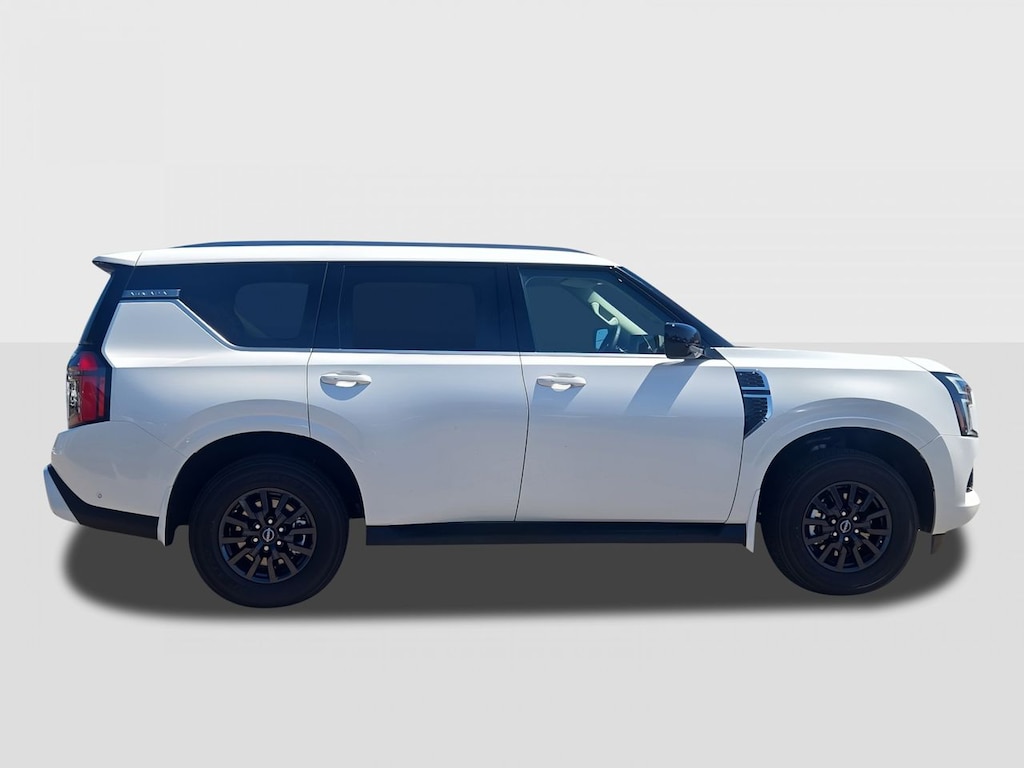 The Aspen White Tricoat exterior, complete with running boards and a rear spoiler, adds a touch of elegance to this rugged SUV, making the 2026 Nissan Armada SV a standout choice for those who demand style and performance in their vehicle.